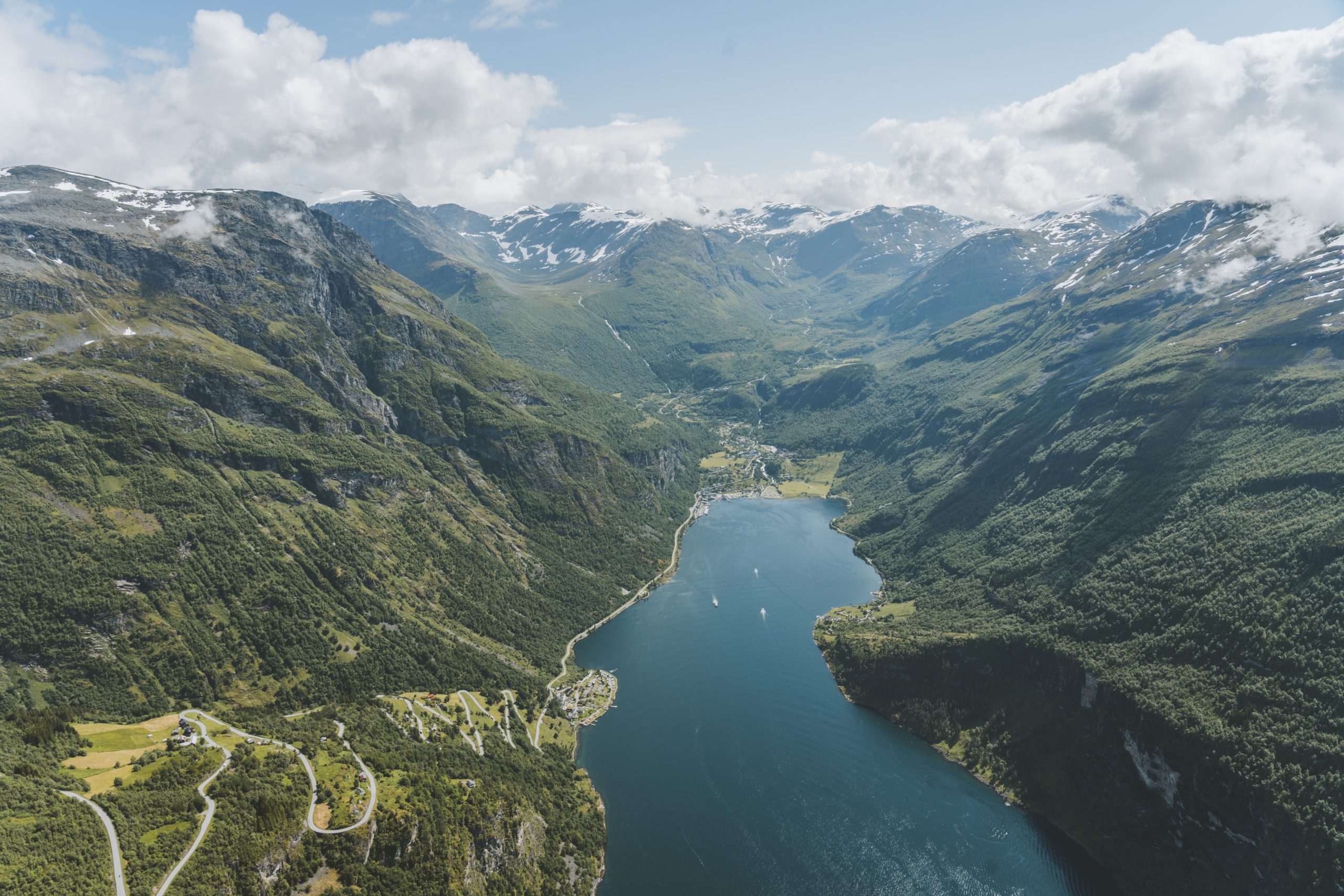 Å se Geirangerfjorden fra helikopter er en opplevelse som gir deg et helt nytt perspektiv på området. Fra lufta har du en panoramautsikt som avslører fjordens dyp og bredd, de omkringliggende fjellene, og de mange fossefallene som stuper ned i vannet. Du vil se hvordan fjorden slynger seg gjennom landskapet som en blå slange, omkranset av snødekte topper og grønne daler. Denne utsikten gir deg en dypere forståelse av fjordens størrelse og de naturlige kreftene som har formet den over tid.